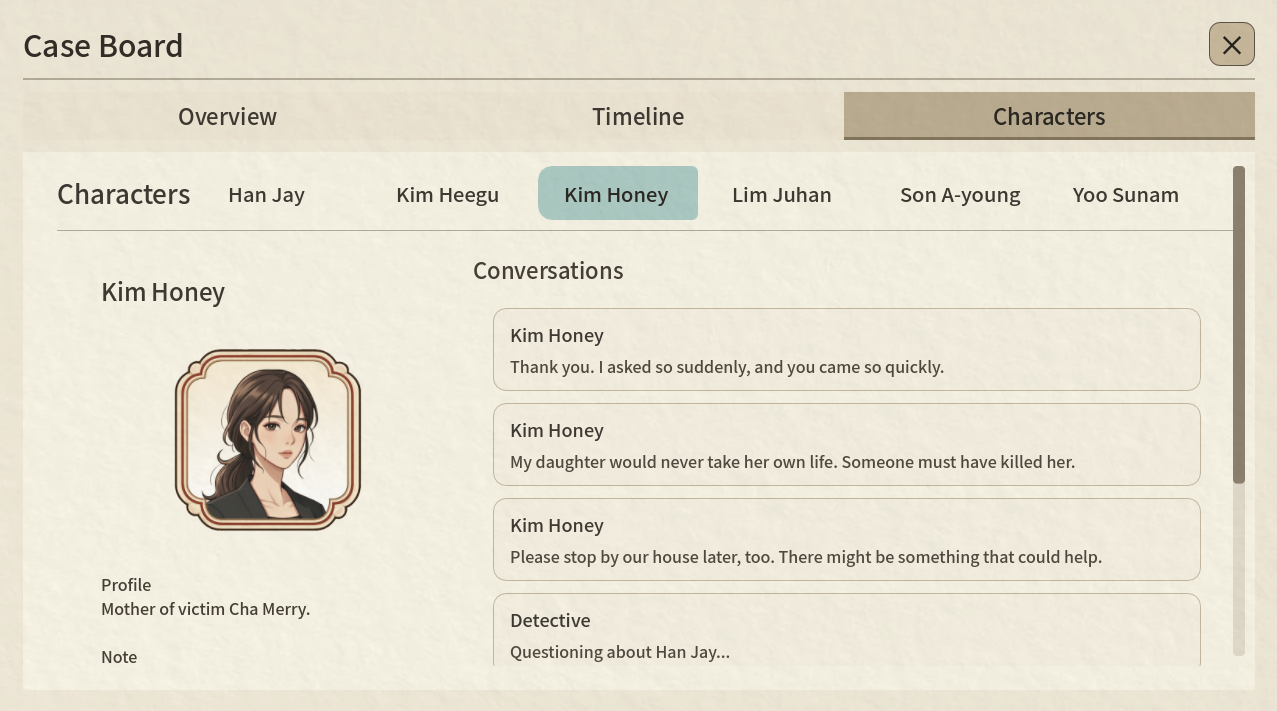 Investigate suspects, collect clues, and uncover the truth through interrogation and deduction.